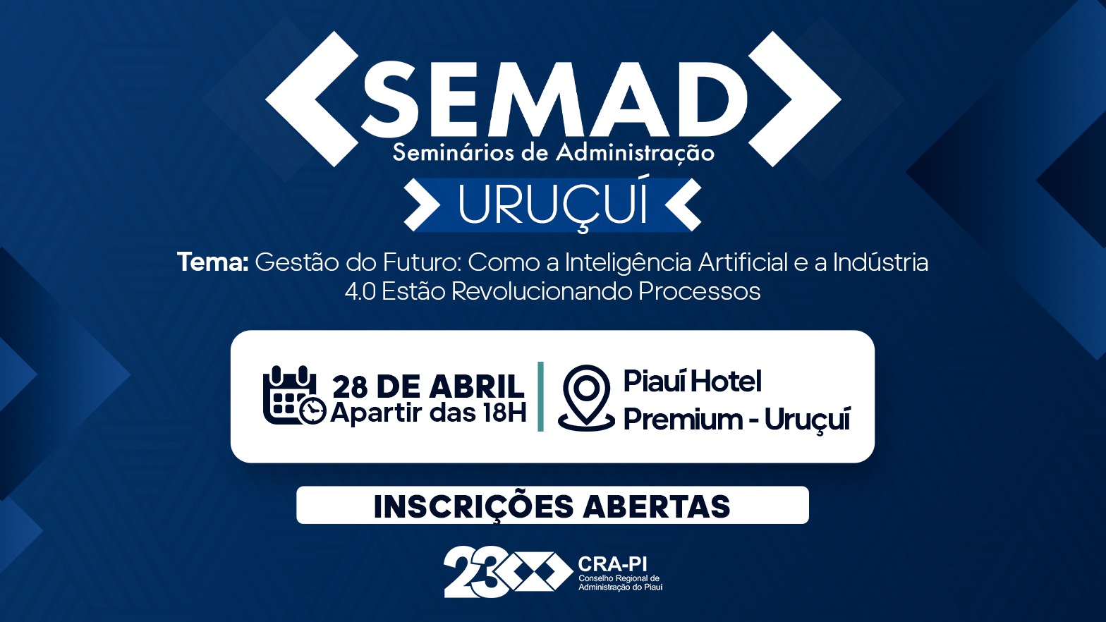 O Conselho Regional de Administração do Piauí (CRA-PI) realizará, no próximo dia 28 de abril, o IV Seminário de Administração (SEMAD) em Uruçuí, reunindo estudantes, profissionais e empreendedores para… Leia mais: IV Seminário de Administração (SEMAD) de Uruçuí: Gestão do Futuro: Como a Inteligência Artificial e a Indústria 4.0 estão revolucionando processos - CRA-PI realiza X SEMAD em Picos e destaca inovação e sustentabilidade na Administração